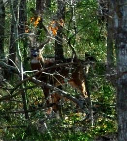 A curious Whitetail Buck watches bikers, as he blends into the woods, just a few yards from our bike path.